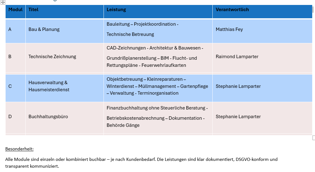 Unsere langjährige Erfahrung in den Bereichen Finanzbuchhaltung, Projektkoordination, technische Zeichnung und Bauleitung hat uns gezeigt, wie oft Menschen bei Bau- und Verwaltungsprojekten zwischen Technik, Organisation und rechtlichen Vorgaben den Überblick verlieren. Genau aus diesem Grund haben wir, Raimond Lamparter, Stephanie Lamparter und Matthias Fey, ein modulares Dienstleistungsunternehmen ins Leben gerufen, das dort ansetzt, wo andere aufhören.